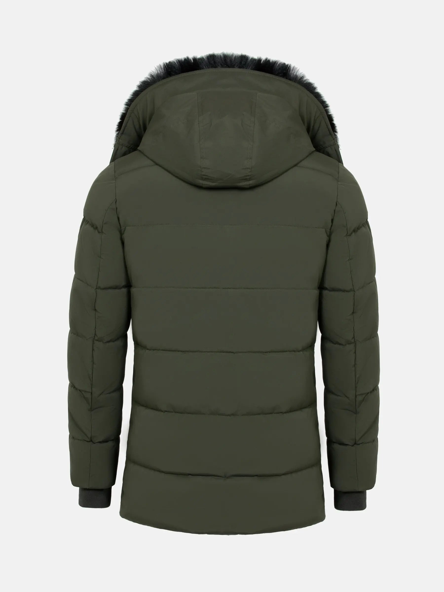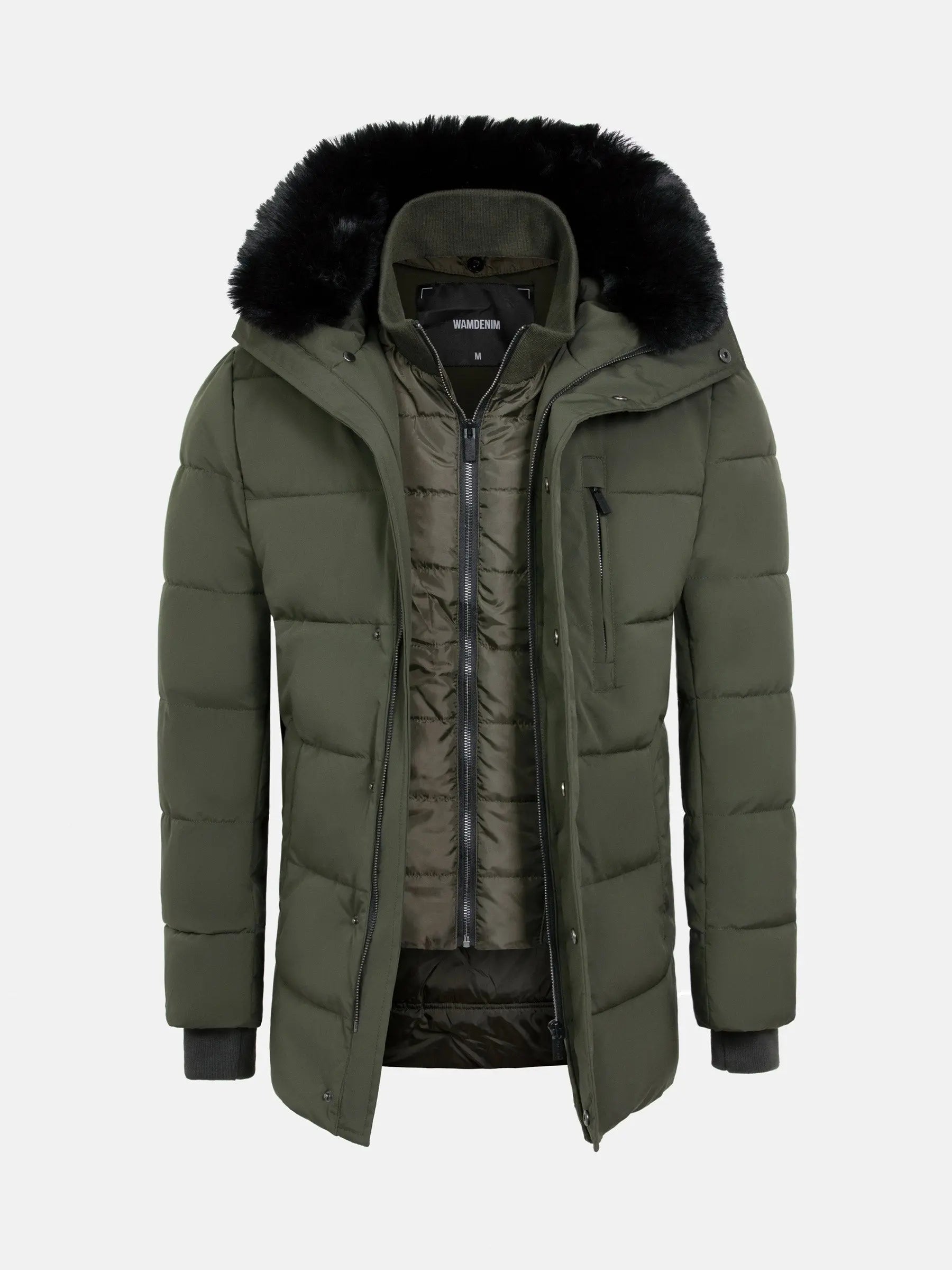 The Kaisen Khaki Winter Jacket is crafted for those who value both function and fashion during the cold months. With its water- and wind-resistant double-layer construction, it keeps you warm and protected in unpredictable weather. The jacket features smart design details such as triple hidden pockets, a practical chest pocket, ribbed cuffs for heat retention, and a secure zip-and-button closure.